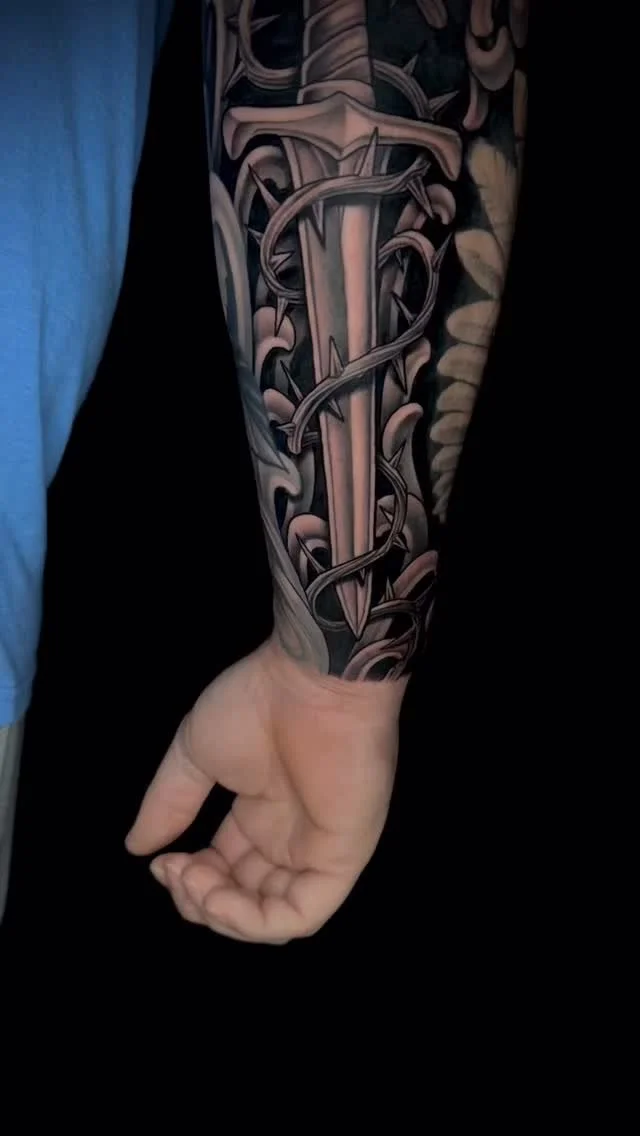 Beyond tattooing I have been a fine artist for over 25 years and enjoy just creating art in any medium, primarily with acrylic and oil paints. As Vincent price once said "A man who limits his interests limits his life", I also enjoy playing music and spending as much time as possible with my family. They are what drives me to succeed. I love hearing my clients ideas and what they are passionate about and turning it into a tattoo they can wear with pride. I strive to create a comfortable and positive experience for every client, ensuring they feel heard and confident in their tattoo design.